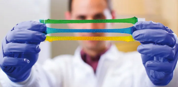The hydrogel itself is a hybrid of two different types of polymers: a seaweed extract called alginate that is used to thicken food, and polyacrylamide, which is the main material in soft contact lenses. When these relatively weak polymers become entangled with each other, they create a molecular network that demonstrates unprecedented toughness and resilience for hydrogel materials — on par with the body’s natural cartilage. When combined with an adhesive layer containing positively charged polymer molecules (chitosan), the resulting hybrid material is able to bind to tissues stronger than any other available adhesive, stretch up to 20 times its initial length, and attach to wet tissue surfaces undergoing dynamic movement (e.g., a beating heart).