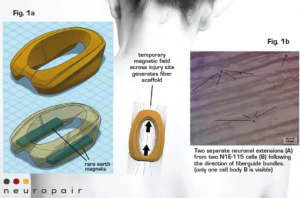 Methods. NeuroPair’s Fibermag™ treatment is applied after the initial, standard stabilization of SCI: The surgeon injects the sterile formulation into the injury site and places a magnetic mouse directly on top of the injury site. The magnetic field assembles the particles into a nontoxic and biodegradable scaffold (see Figures 1a and 1b). After five minutes, the field is removed, the scaffold is in place and remains stable yet flexible for weeks. The guided regrowth of axons and neurites along the magnetic fibers can be seen in vitro by brightfield and fluorescence microscopy over the course of several days and weeks. The Fibermag formulation consists of commercially available core components: biocompatible magnetic nanoparticles and slow-release bioactive factors in a hyaluronic acid-based gel.