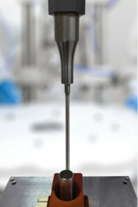 Fig. 3 – Specialized long-reach tooling can reach down into the narrow cavity of a battery or product case, either to weld the “tabs” of a battery electrode to the base of the battery case or to join elements within the device to battery power. (Credit: Emerson)