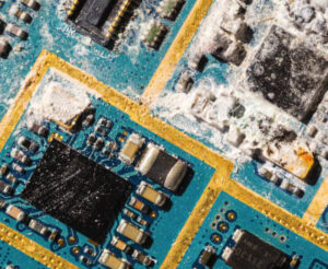 Particulate: Commonly present on PCBs, particulate contamination varies in size from submicroscopic to visible debris such as dust, dirt, fibers, and metal chips. Electrostatically adhered to PCB surfaces, particulates need an electrostatic polar cleaning fluid to disrupt the bond and displace them. Added agitation, such as vibrating ultrasonic energy or boiling action, aids in enhancing the cleaning fluid’s effectiveness in removing insoluble contamination.