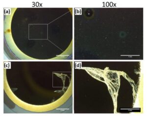 Physical Degradation Results: To assess and compare the physical durability of different coatings during use, the authors exposed two types of coatings, Dursan and AF1600, to 10 minutes of sonication in ethanol. Multiple sensors of each coating were sonicated, and all of the Dursan-coated sensors remained intact after the treatment, whereas a few of the sonicated AF1600-coated sensors exhibited coating delamination as shown in Figure 1.