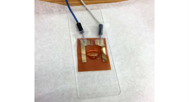 Purdue researchers have created an electrode coated with a material that has a high surface area that can detect viruses such as Zika and Dengue in mosquitoes. The device immobilizes specific biological molecules able to bind to the RNA of the virus. When the DNA or RNA of a virus-infected mosquito binds to the surface, it changes the surface resistance on the electrode. Image courtesy of Purdue.
